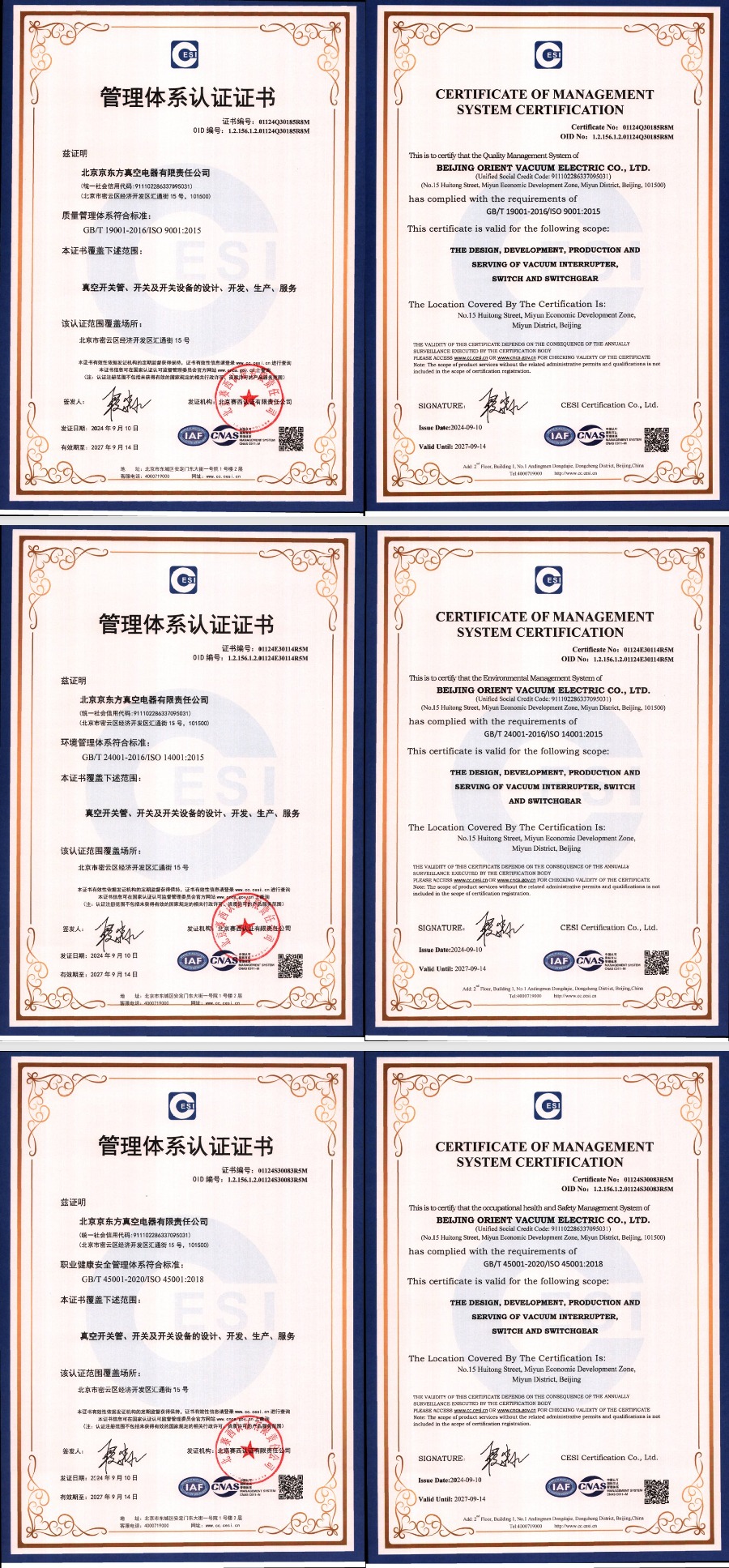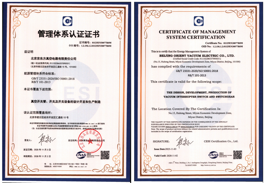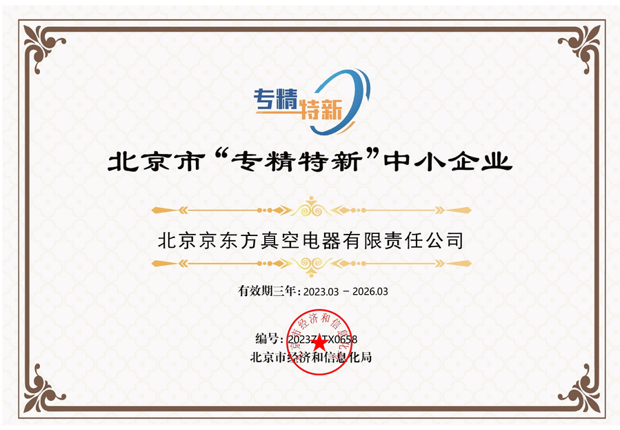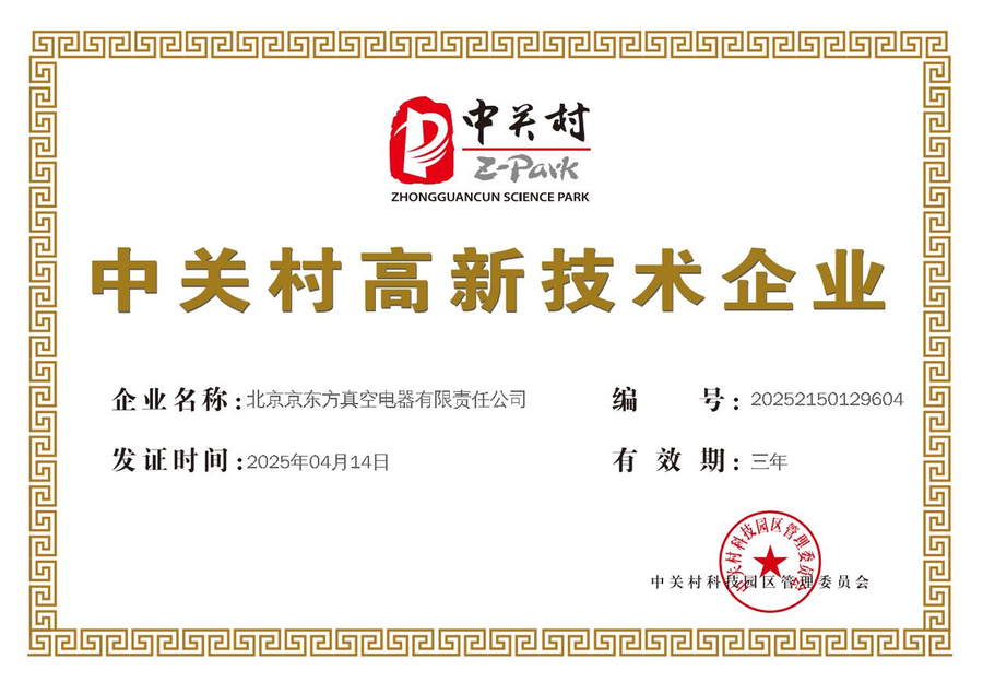北京京东方真空电器有限责任公司目前已经通过了GB/T 19001-2016/ISO 9001:2015质量管理体系认证、GB/T 24001-2016/ISO 14001:2015环境管理体系认证、GB/T 45001-2020/ISO 45001:2018职业健康安全管理体系认证、GB/T23331-2020/ISO 50001:2018能源管理体系认证,同时也是北京市高新技术企业、北京市“专精特新”企业。